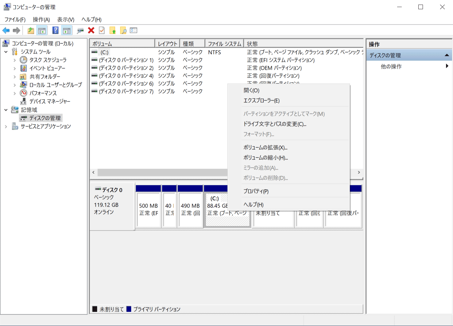 まずWindows10がインストールされているハードディスク領域を縮小してインストールする領域を作成する。しかしその前に領域をできるだけ大きく作成するためにWindowsの「休止状態」や「ページングファイル」機能を無効にするとよいのかもしれない(←よく調べていないので間違っているかも)