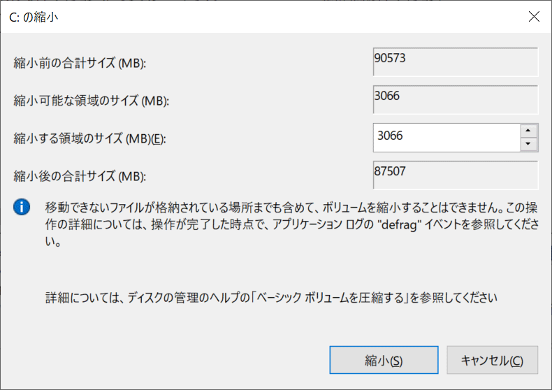 「縮小する領域のサイズ(MB)(E)」に適当な数字を入力して「縮小(S)」をクリック。今回は未割り当て領域を25GBほど作成