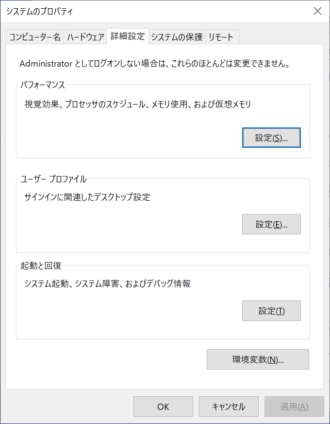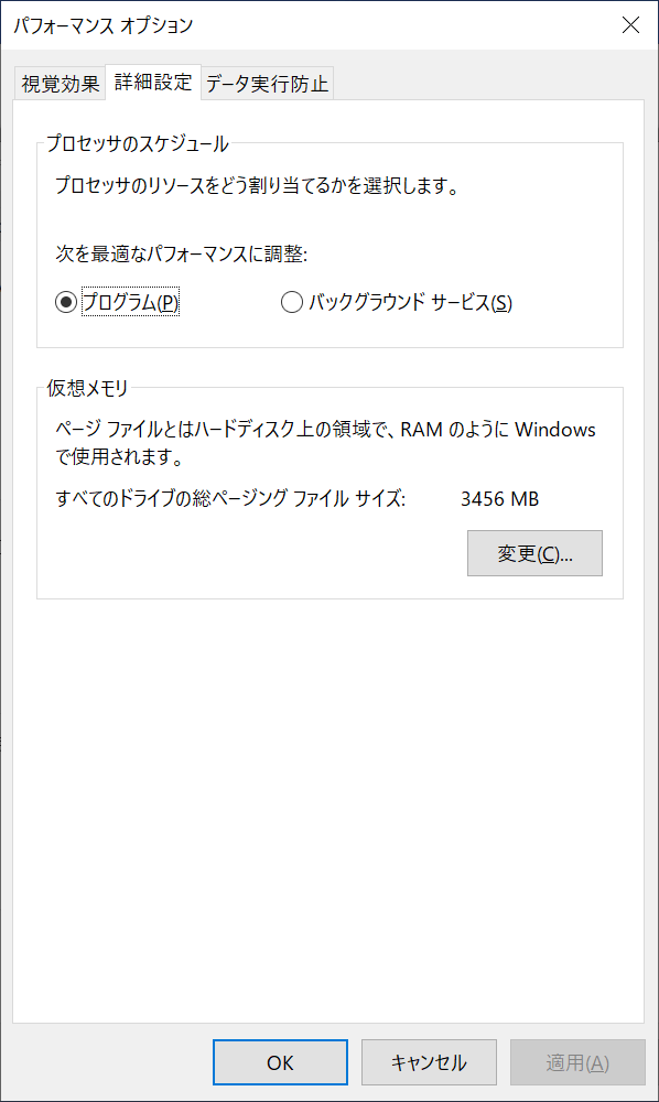 「詳細設定」「仮想メモリ」「変更(C)」